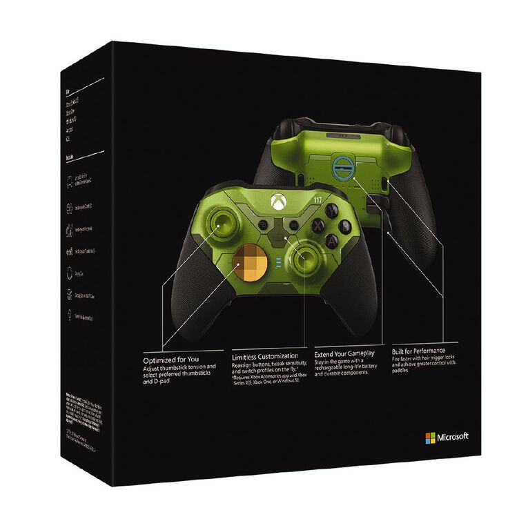 Станьте элитой Облачитесь в доспехи величайшего героя человечества с беспроводным геймпадом Xbox Elite Series 2 ограниченной серии Halo Infinite, который предлагает более 30 новых возможностей для профессиональной игры. Выберите одну из трех настроек ограничителей курков, чтобы вести стрельбу со скоростью бывалого Спартанца. Повысьте свои игровые показатели за счет мини-джойстиков с регулировкой упругости хода и полностью контролируйте игру за счет прорезиненных накладок. Оптимизируйте геймпад под свой уникальный игровой стиль с помощью сменных мини-джойстиков и лепестков различной формы. Вы можете хранить до 3 пользовательских профилей и один профиль по умолчанию в памяти геймпада и переключаться между ними на ходу при помощи кнопки «Профиль». Подключайтесь через беспроводную связь Xbox, Bluetooth или с помощью входящего в комплект поставки специального зелено-оранжевого кабеля USB-C и играйте на Xbox One и устройствах с Windows 10. Опробуйте безграничные возможности персонализации, доступные в приложении «Аксессуары Xbox». Используйте эксклюзивные возможности настройки, включая изменяемую раскладку. Выберите кнопку, которая будет выступать в качестве переключателя, чтобы назначать альтернативные функции для других кнопок. Батарея на 40 часов автономной работы позволит вам реже прерываться, а все элементы геймпада рассчитаны на продолжительное интенсивное использование. Заряжайте геймпад внутри или снаружи специального темно-зеленого кейса для переноски с эмблемой UNSC (ККОН), в прилагаемой черно-серой док-станции с лазерной гравировкой или с помощью специального зелено-оранжевого кабеля USB-C.