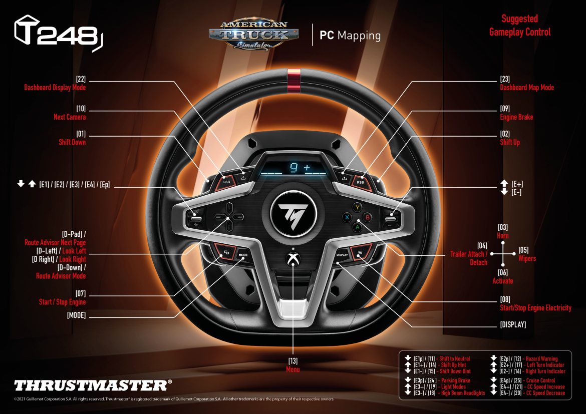 T248 обеспечивает на 70% больше мощности (по сравнению с предыдущей серией гибридных гоночных рулей Thrustmaster T150) и оснащен передовыми функциями и компонентами, среди которых предустановки для эффекта обратного сопротивления, которые можно изменить в процессе игры, магнитные подрулевые переключатели, интерактивный экран с отображением более 20 различных элементов информации и магнитный педальный блок с 4 режимами нажатия педали тормоза.