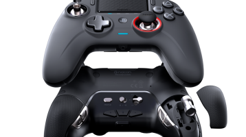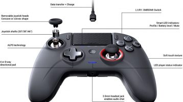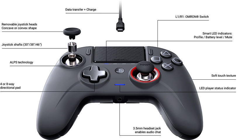 Компания NACON представляет свой новый вариант «революционного» контроллера для PS4 и Windows. Устройство, получившее название Revolution Unlimited, является логическим продолжением цепочки Pro-контроллеров производителя. Особенности и преимущества Revolution Unlimited Pro Controller беспроводное подключение (рабочая дистанция — до 7 метров); кабель для проводного подключения с разъёмом USB-C; аккумулятор на 1300 мАч (автономная работа до 7 часов); взаимозаменяемые грузики на 10, 14 и 16 грамм; четырёх- или восьмипозиционная крестовина; четыре программируемые задние кнопки; 3.5 мм разъём для гарнитуры; кнопки регулировки громкости и отключения микрофона; регулируемый наклон стиков (амплитуда 30, 38 и 46 градусов); сменные шляпки (вогнутая и выпуклая); кейс для переноски; продвинутое ПО для настройки на PC и Mac.