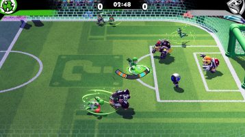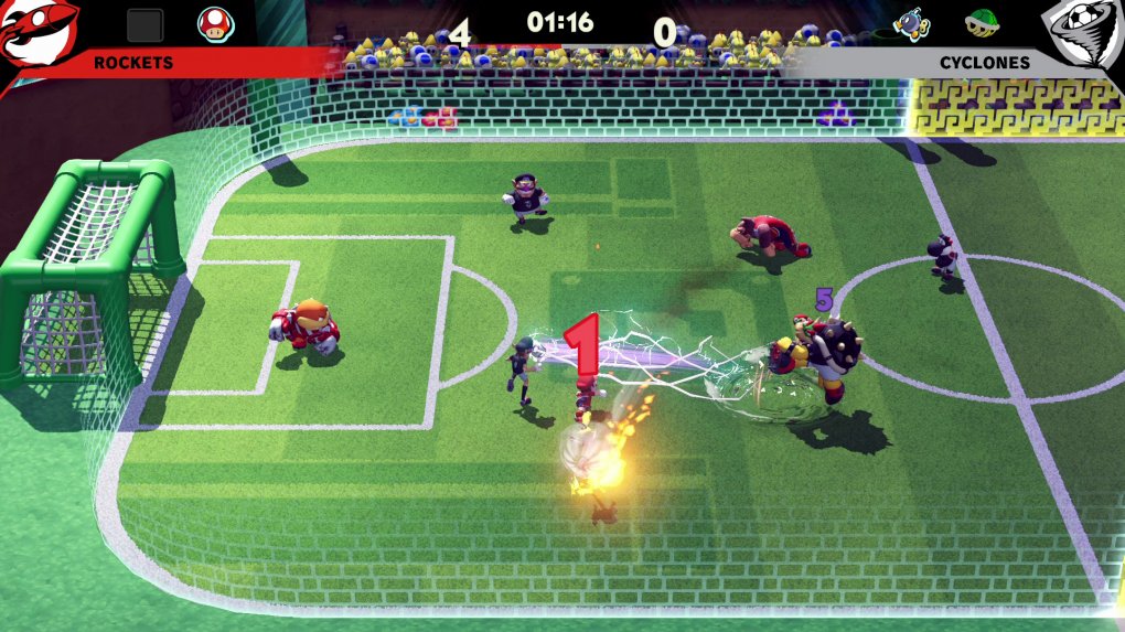 Выполняйте финты, отдавайте пасы партнерам по команде и забивайте голы. Также используйте толчки, предметы и не берущиеся особые удары. Если заметите на поле шар, хватайте и заряжайте его, пока соперники не обращают на вас внимание. После этого выполните гиперудар, который принесет вам сразу два гола!