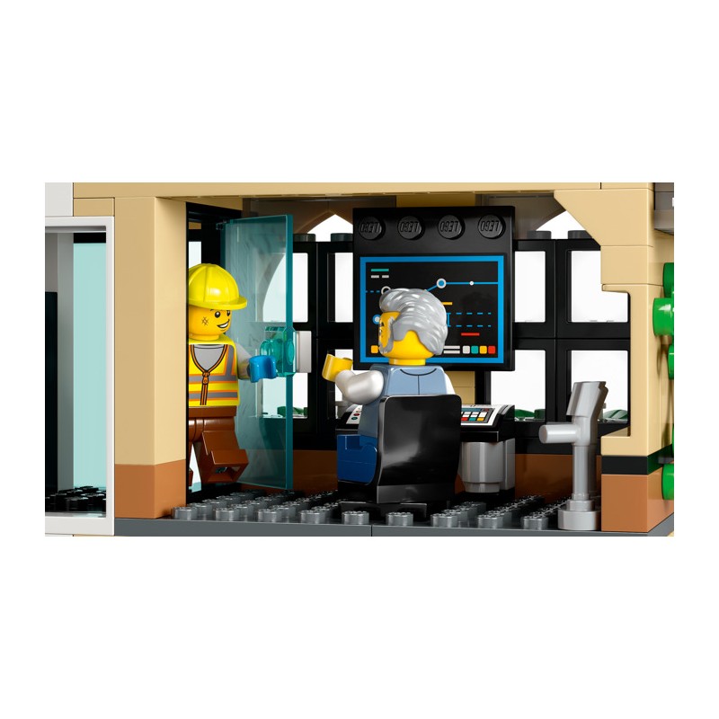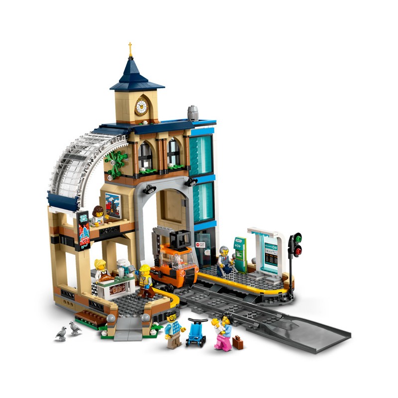 Эта конструкторская игрушка LEGO® City Central Train Station (60469) для детей от 7 лет и старше наполнена крутыми функциями для творческой игры на 3 уровнях. Увенчанная классической часовой башней, игрушечная станция включает в себя уютную кофейню, работающий лифт, диспетчерскую, автобусную остановку, 2 пассажирские платформы, дисплей с расписанием и билетный автомат. Дети также получают железнодорожное транспортное средство с подъемником для вишен, а также 6 минифигурок, фигурку ребенка и 2 фигурки голубей для ролевой игры и рассказывания историй.