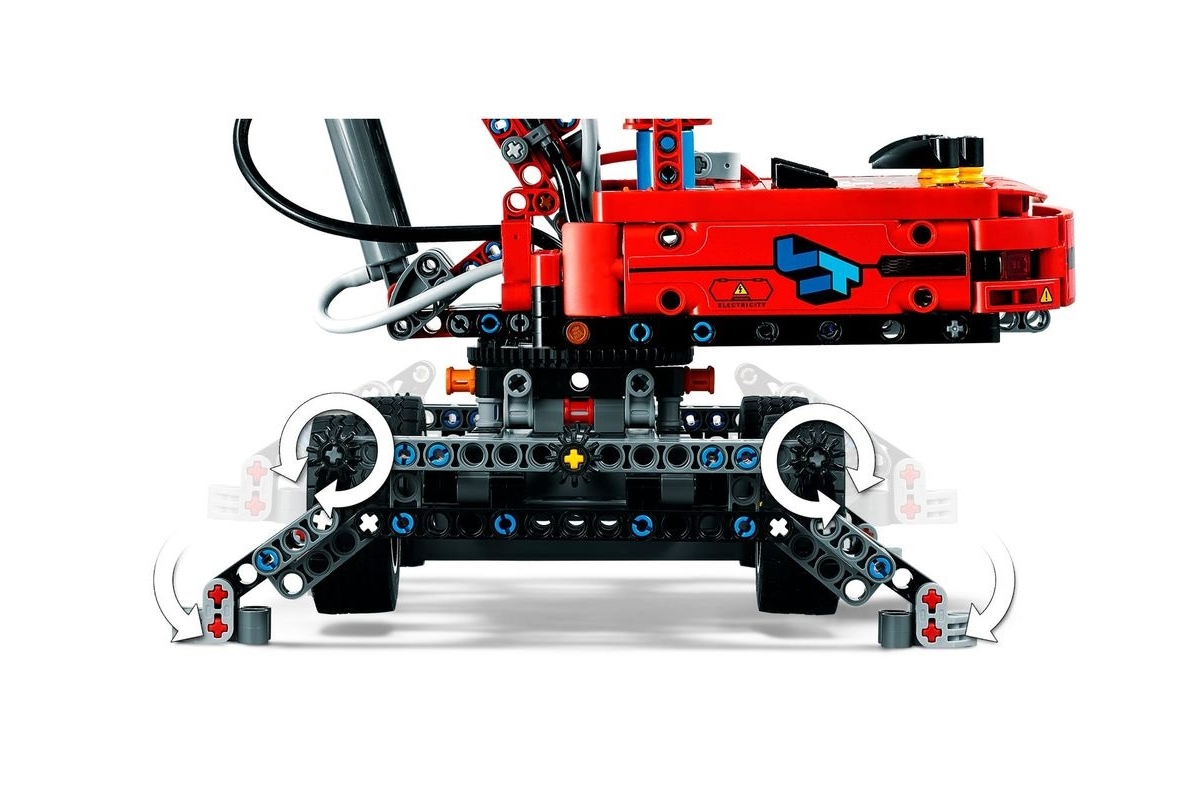 Условно, сборка разделена пакетиками на 3 этапа: основа, “тело” и шарнирная рука. Первая секция завершается быстро, в результате получается скелетообразное ходовое шасси. Передними колесами можно управлять с помощью ручной передачи в передней части автомобиля, а на каждом углу есть выносные опоры. Они приводятся в действие небольшими зубчатыми колесами, которые опускают крепкие опоры в каждом углу, поднимая колеса над землей и придавая автомобилю устойчивость при использовании в качестве крана. Вторая партия – это кузов автомобиля, внутри которого размещаются шланги и регулирующие клапаны пневмосистемы, а также ручной насос. Вся конструкция опирается на поворотный стол, который позволяет кабине и стреле перемещаться на 360 градусов. Затем строится и прикрепляется кабина водителя. Последнее – это создание руки. Чрезвычайно прочная стрела шарнирно соединена в двух точках: сначала в месте крепления к корпусу крана, а затем выше в «колене». Каждая секция создается отдельно, а затем прикрепляется по очереди, и в обеих используется здоровенный пневматический цилиндр.